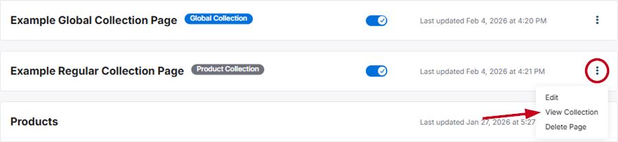 For both global and regular collection pages, the three-dot menu will provide the "Edit" option which enables you to update the page and SEO information, as well as the option to delete the page.