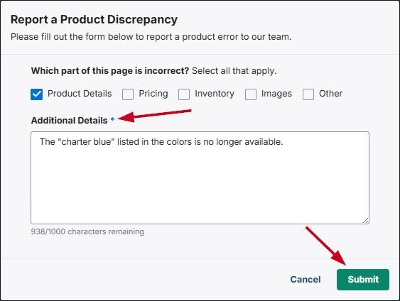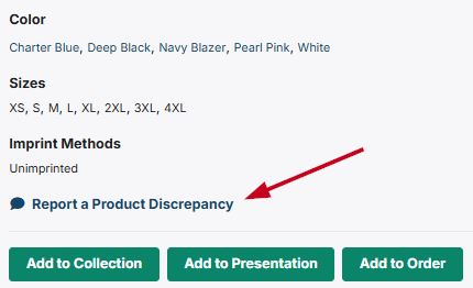 All products listed in ESP+ are subject to change without notice and Distributors should verify final pricing with the Supplier. Distributors may report issues with inconsistent product information and pricing to ASI for follow-up with the Supplier to confirm data accuracy. In ESP+, Distributors may submit an inaccuracy by clicking on the "Report a Product Discrepancy" link from the Product Detail page.In the Report a Product Discrepancy window, use the checkboxes to indicate the inaccurate data and type a description of the issue. Then, click on the Submit button.