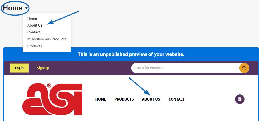 When editing a page, you can access any other page on the site to edit it by clicking on the menu item in the site preview, or by clicking on the page name drop-down and selecting the page you want to edit.