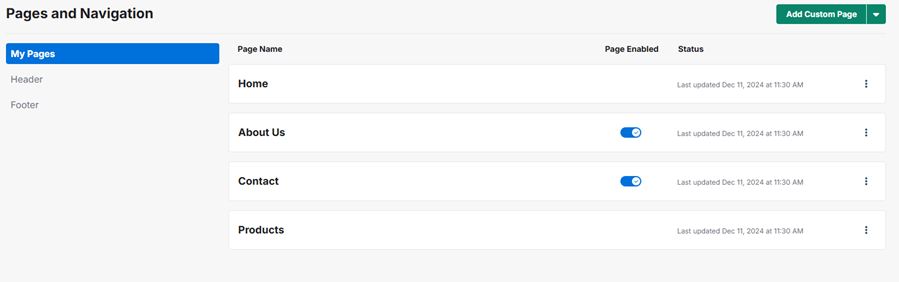 • About Us: This page contains a short blurb about your company which can be edited at any time. The page can be edited or deleted. You can also disable the page.
