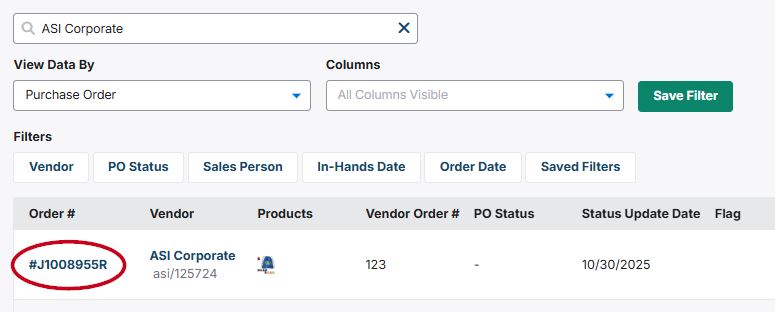 You can use the search and filter options to help locate the purchase order. After locating the purchase order, click on the order number to open it.