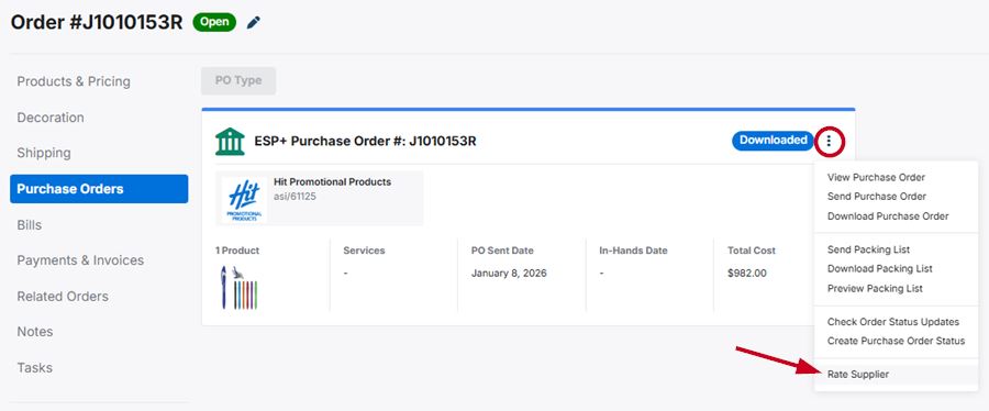 Next, click on the Purchase Orders option on the left to view all purchase orders. Click on the three-dot icon and select "Rate Supplier" from the drop-down menu.