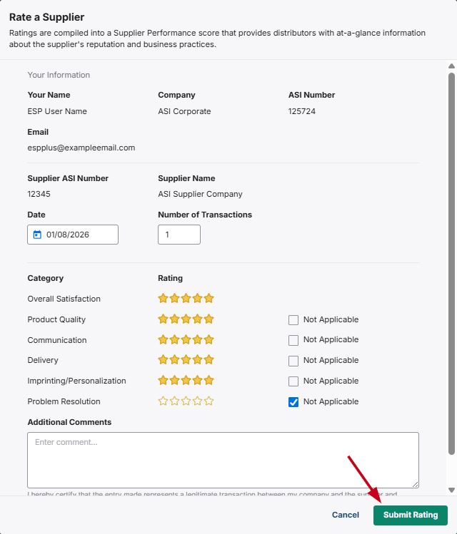 The "Rate a Supplier" window will open and display your account information followed by the supplier's ASI number and name. Enter the date and number of transactions you have completed with this supplier.