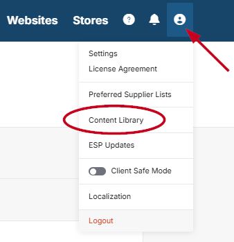 The Content Library is where all assets, elements, and articles can be stored for your ESP+ website. To access the content library, click on the user icon in ESP+ and click on Content Library.