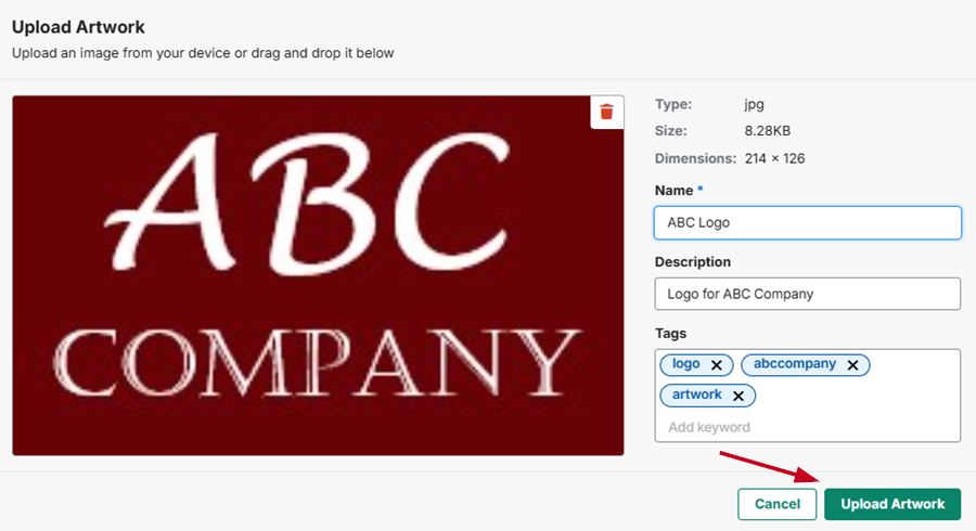 After uploading the file, you can give the asset a name, description, and tags. Tags can be used to easily find assets later. To add tags, enter the tag keyword and hit the enter key. Once you are done, click on the "Upload Artwork" button.