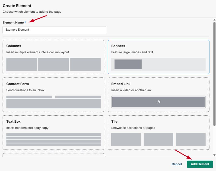 To create an element to display on your website, click on the "Create Element" button.