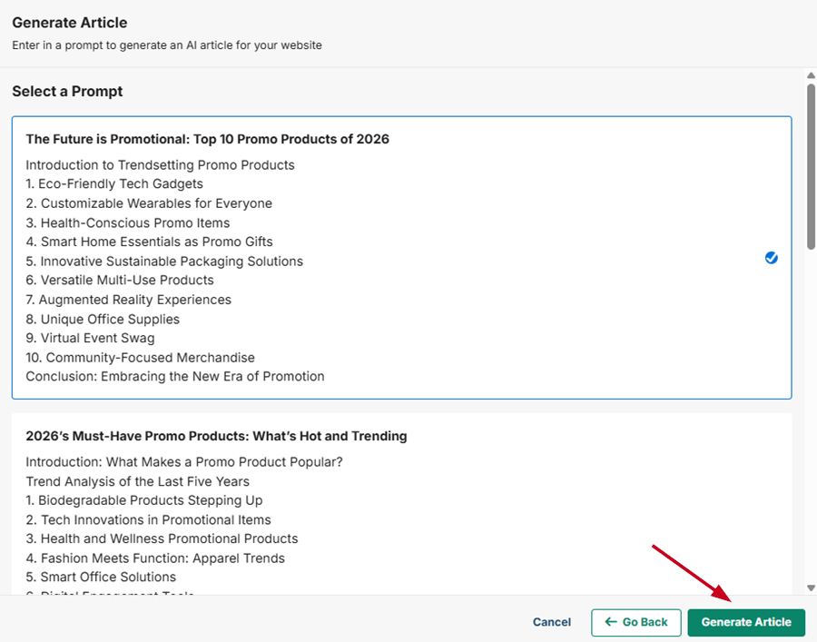 Select a prompt, then click Generate Article and let AI write an article for your website.