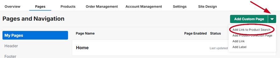 To add a saved search, first click the down arrow next to "Add Custom Page" and then click "Add Link to Product Search"